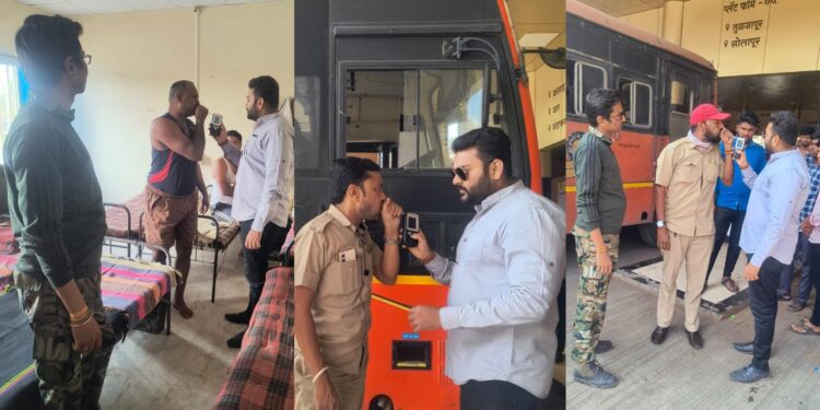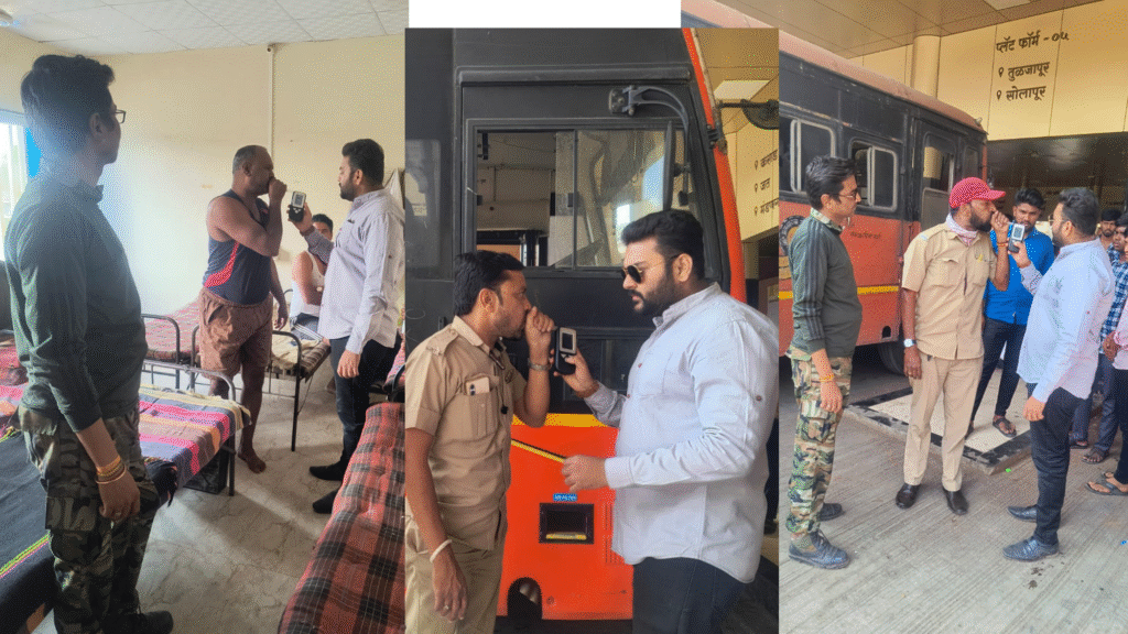 एसटी महामंडळाच्या बसेसच्या माध्यमातून राज्यातील महिला, पुरुष, ज्येष्ठ नागरिक व विद्यार्थी लाखोंच्या संख्येने दररोज प्रवास करतात. सुरक्षित आणि सुखरुप प्रवास हे ब्रीद एस टी महामंडळाचे असून याप्रमाणेच प्रवाशांना सेवा दिली जाते. ही सेवा एस टी महामंडळ अधिकारी व कर्मचारी यांच्या माध्यमातून देण्याचा प्रयत्न करते. मात्र, यातील काही चालक आणि वाहक मद्य प्राशन करून कर्तव्यावर जात असल्याचे परिवहन मंत्री सरनाईक यांच्या निदर्शनास आले. त्यामुळे त्यांनी राज्यातील सर्व आगारांमध्ये चालक आणि वाहक यांची ड्युटीवर जाण्यापूर्वी म्हणजेच आगारात आल्याबरोबर अल्कोहोल तपासणी करण्याचे आदेश दिले आहेत. त्या आदेशाची अंमलबजावणी करण्यासाठी एस टी महामंडळ धाराशिव विभाग नियंत्रक अजय पाटील यांनी सर्व आगार प्रमुखांना सक्तीच्या सूचना दिल्या आहेत. त्यांनी प्रत्यक्ष यंत्रणा कार्यान्वित करून अल्कोहोल तपासणी करण्यावर जोर दिला आहे. त्यामुळे अधिकाऱ्यांनी पथकाची नेमणूक करून तपासणी सुरू केले आहे. यावेळी तपासणी करणारे वाहतूक निरीक्षक याहिया काझी, सहाय्यक वाहतूक अधीक्षक कोमटवार व इतर पर्यवक्षीय कर्मचारी आणि अधिकारी उपस्थित होते.