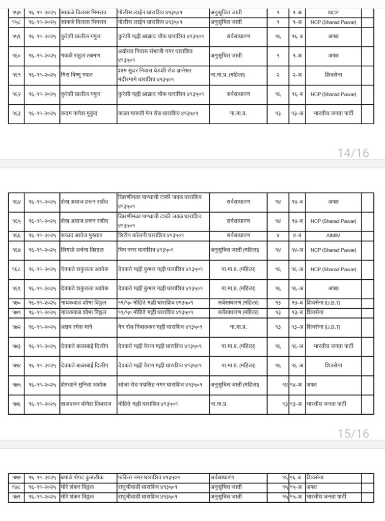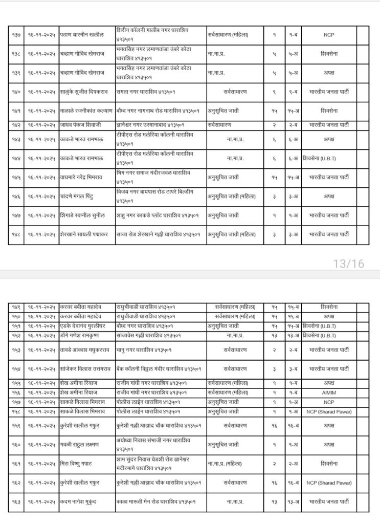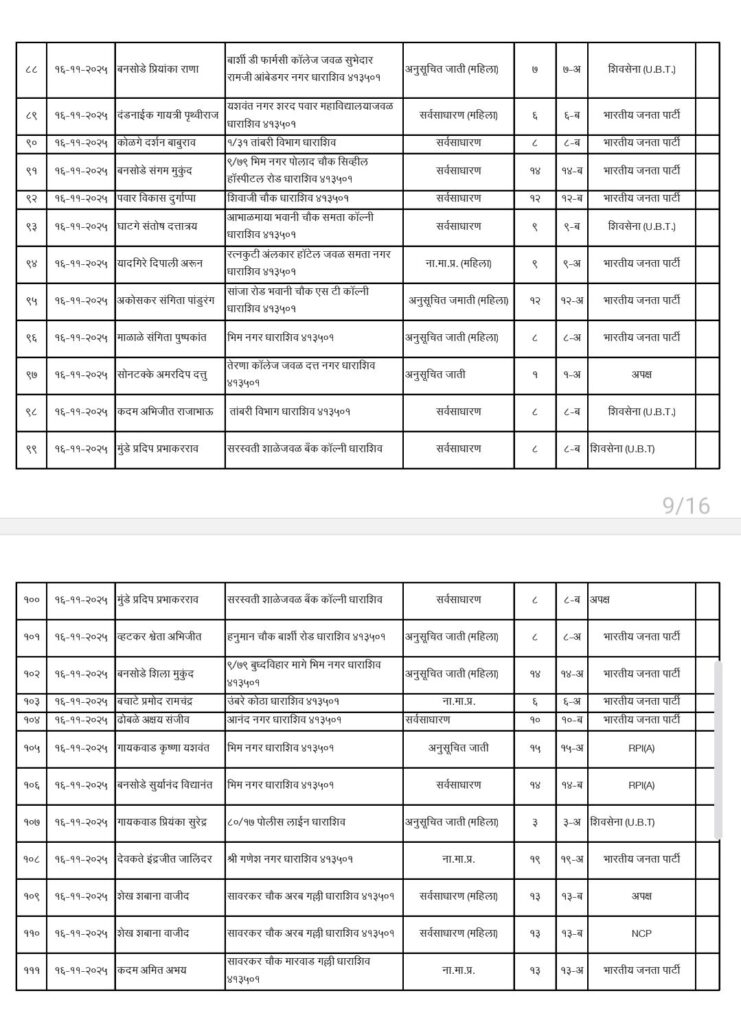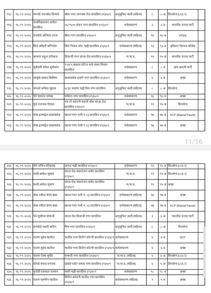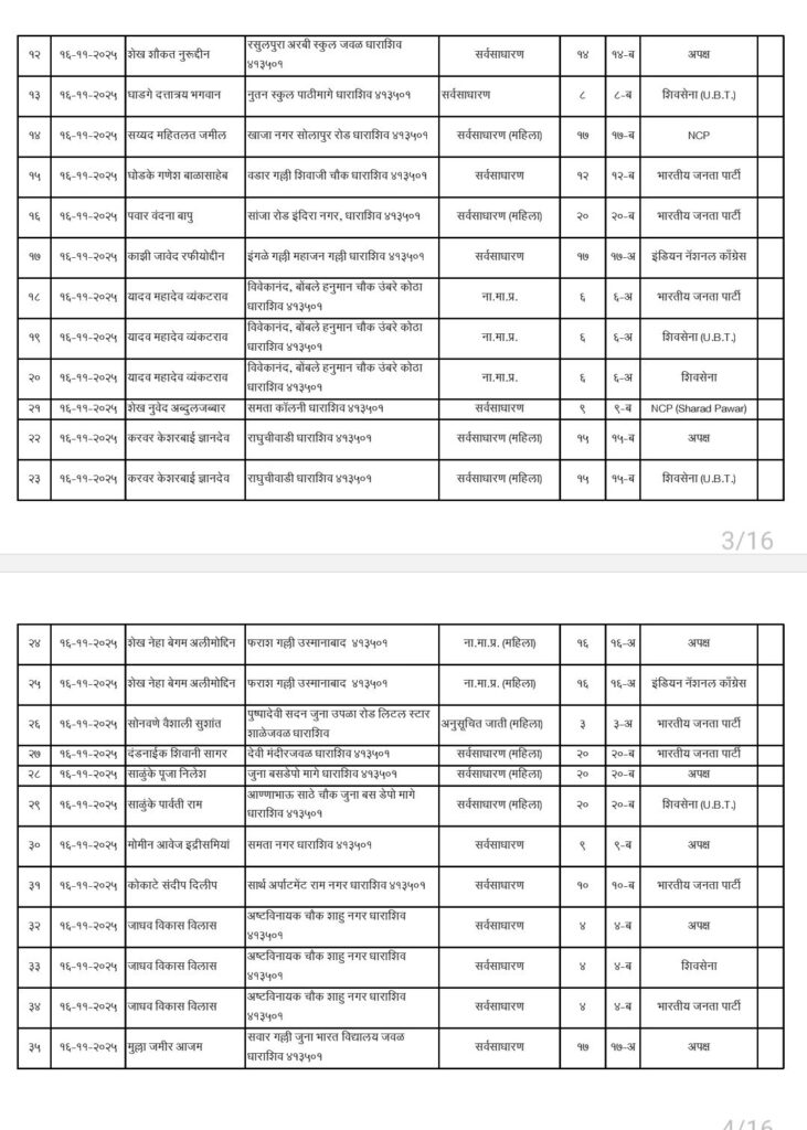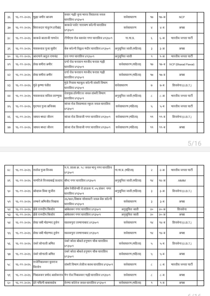 • शिवसेना उद्धव बाळासाहेब ठाकरे आणि काँग्रेस पक्षाचे धाराशिवनगर परिषदेचे अधिकृत उमेदवारी जाहीर हे आहेत नगराध्यक्ष आणि नगरसेवक उमेदवार