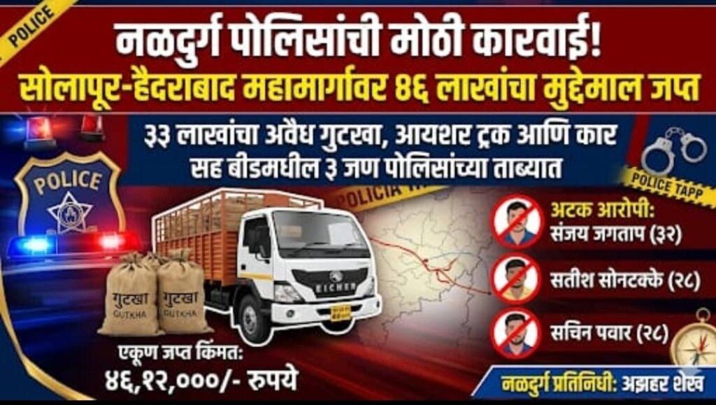 दि. 27 मार्च 2026 रोजी सकाळी 9.12 वाजण्याच्या सुमारास नळदुर्ग बायपास रोडवरील निसर्ग हॉटेलजवळ पोलीस कर्मचारी शासकीय कामकाज करत असताना संशयास्पद आयशर टॅम्पो (क्र. MH 16 CD 2395) आढळून आला. तपासणी केली असता, महाराष्ट्र शासनाने प्रतिबंधित केलेला व मानव आरोग्यास घातक असलेला गोवा गुटखा मोठ्या प्रमाणात वाहतूक केला जात असल्याचे उघड झाले.