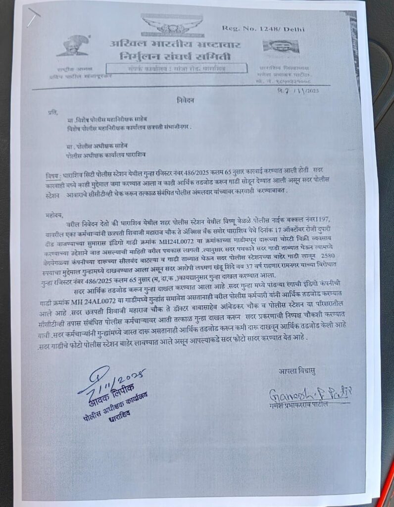 धाराशिव : धाराशिव शहर पोलीस ठाण्यात नोंद झालेल्या गुन्हा रजिस्टर क्रमांक 486/2025 कलम 65 (म.दा.का.) अंतर्गत कारवाई दरम्यान मोठ्या आर्थिक गैरव्यवह झाल्याचा आरोप पाटील यांनी केला आहे.