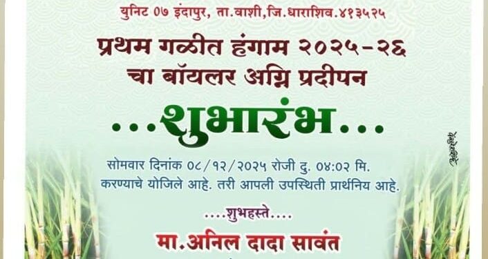 वाशी (प्रतिनिधी) वाशी तालुक्यातील इंदापूर येथील मागील अनेक वर्षापासून बंद पडलेला नरसिंह सहकारी साखर कारखाना यंदा सुरू होत आहे. याचा बॉयलर अग्निपूजन सोहळा उद्या दिनांक 8 डिसेंबर रोजी चार वाजता करण्याचे आयोजन कारखाना प्रशासनाच्या वतीने करण्यात आलेली आहे. तरी या सोहळ्यास कार्यक्षेत्रातील सर्व शेतकऱ्यांनी उपस्थित राहावे असे आवाहन भैरवनाथ शुगर मिल्स चे चेअरमन अनिल सावंत व व्हाईस चेअरमन विक्रम सावंत यांनी केले आहे.