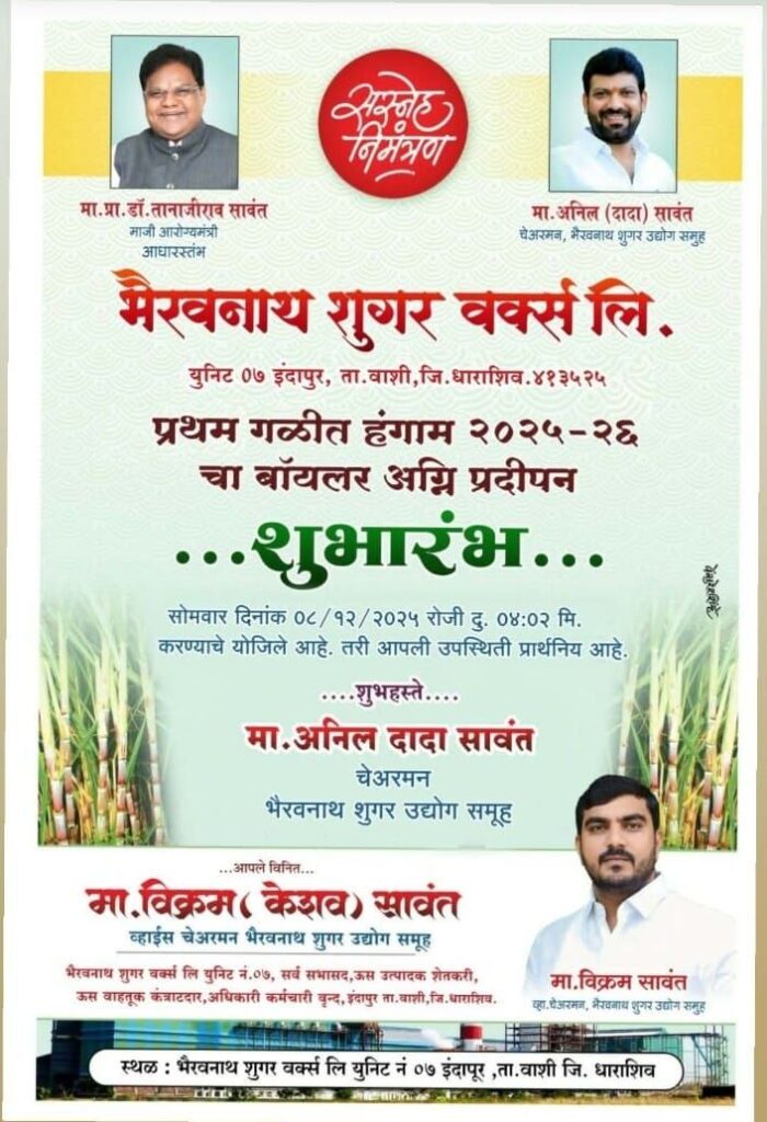 मतदारसंघातील शेतकऱ्यांचे हित जोपासणाऱ्या व दीर्घकाळ बंद पडलेल्या नरसिंह सहकारी साखर कारखान्याच्या बॉयलर अग्निप्रज्वलन सोहळ्याचे आयोजन करण्यात आले आहे. महाराष्ट्र राज्याचे माजी आरोग्य मंत्री व भूम परंडा वाशीचे विकासरत्न आमदार प्राध्यापक डॉक्टर तानाजीराव सावंत साहेब यांच्या नेतृत्वाखाली हा कारखाना पुन्हा सुरू होत असल्याने कार्यक्षेत्रातील शेतकऱ्यांमध्ये उत्साहाचे वातावरण आहे.