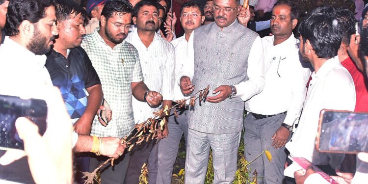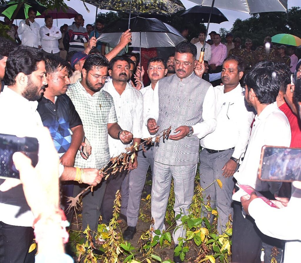 धाराशिव तालुक्यातील वडगाव (सिद्धेश्वर) येथे नुकसानग्रस्त शेत पिकांची पाहणी भर पावसात  पालकमंत्री सरनाईक यांनी आज केली. यावेळी ते बोलत होते. वडगाव (सि.) येथील शेतकरी भुजंग जानराव यांनी लावलेल्या दोन एकर सोयाबीन पिकांची पाहणी पालकमंत्री सरनाईक यांनी केली व जानराव यांची व्यथा त्यांच्या बांधावर जात जाणून घेतली. यावेळी गजेंद्र जाधव यांनीही परिसरातील पिकांच्या नुकसानीची माहिती पालकमंत्री सरनाईक यांना दिली.