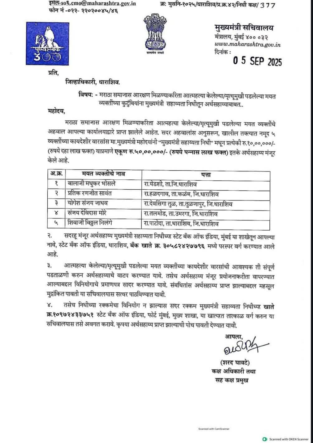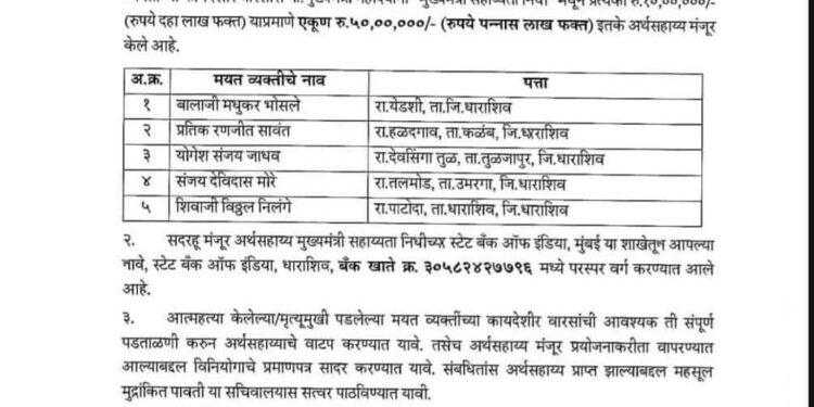 उपोषण सोडविताना सरकारच्या उपसमितीने दिलेल्या आश्वासनानुसार आत्महत्याग्रस्त कुटुंबांच्या खात्यावर अर्थसहाय्य जमा होण्यास सुरुवात झाली आहे. पीडित कुटुंबीयांनी आवश्यक कार्यवाहीसाठी स्थानिक जिल्हाधिकारी कार्यालयाशी संपर्क साधावा, असे आवाहन करण्यात आले आहे.