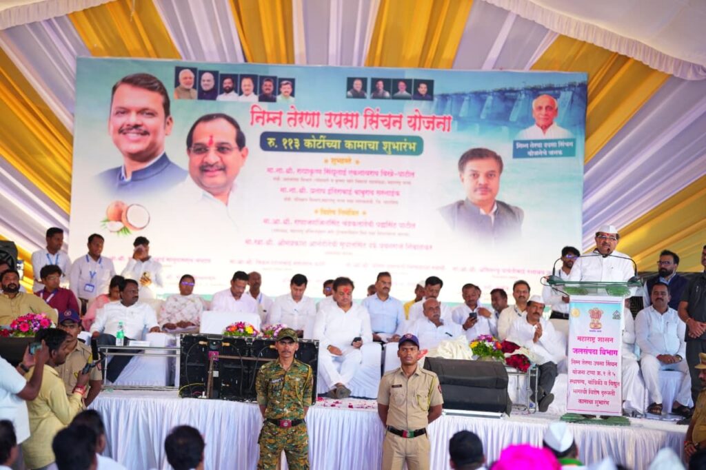 निम्न तेरणा उपसा सिंचन योजनेच्या दुरूस्ती कामाचे भूमिपूजन ना. राधाकृष्ण विखे पाटील यांच्या हस्ते धाराशिव तालुक्यातील करजखेडा येथे पार पडले. यावेळी ते बोलत होते. माजी मंत्री डॉ. पद्मसिंह पाटील हे तेरणा उपसा सिंचन योजनेचे शिल्पकार आहेत. त्याचबरोबर त्यांच्यामुळेच कृष्णा खोर्‍यातील हक्काचे पाणी मराठवाड्यासाठी देण्याचा महत्वपूर्ण निर्णय झाला आहे. डॉ. पद्मसिंह पाटील यांनी ज्या तळमळीने शेतकरी आणि ग्रामीण भागातील नागरिकांसाठी अविरत काम केले, तीच तडफ अभ्यासू, कर्तबगार आणि धडाडीचे नेते राणाजगजितसिंह पाटील यांच्या ठायी आहे. राणाजगजितसिंह पाटील यांच्या पाठपुराव्यामुळेच अशक्यप्राय असलेली निम्न तेरणा उपसा सिंचन योजना लवकरच कार्यान्वित होणार आहे. आम जनतेच्या अडचणी दूर करणे हे आपल्या महायुती सरकारचे काम आहे. पुढच्या ऑगस्टपर्यंत ही योजना पूर्ण करण्याचा प्रयत्न असल्याचे त्यांनी सांगितले.