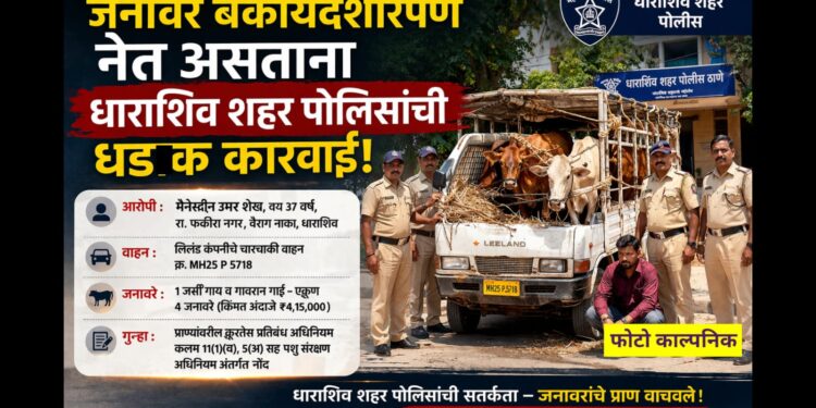 धाराशिव शहरात जनावरांवर अत्यंत निर्दयपणे वागणूक देत बेकायदेशीर वाहतूक करणाऱ्या आरोपीविरोधात धाराशिव शहर पोलिसांनी कठोर कारवाई करत गुन्हा दाखल केला आहे. पोलिसांच्या या धाडसी आणि संवेदनशील कारवाईमुळे चार गोवंशीय जनावरांचे प्राण वाचले असून नागरिकांकडून पोलिसांचे कौतुक होत आहे.