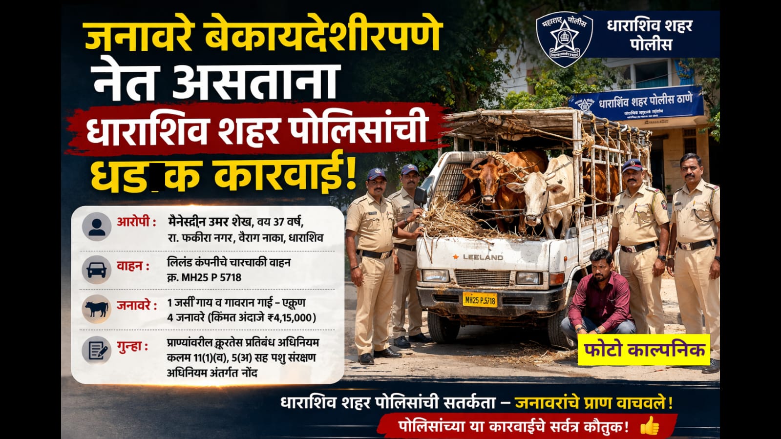 धाराशिव शहरात जनावरांवर अत्यंत निर्दयपणे वागणूक देत बेकायदेशीर वाहतूक करणाऱ्या आरोपीविरोधात धाराशिव शहर पोलिसांनी कठोर कारवाई करत गुन्हा दाखल केला आहे. पोलिसांच्या या धाडसी आणि संवेदनशील कारवाईमुळे चार गोवंशीय जनावरांचे प्राण वाचले असून नागरिकांकडून पोलिसांचे कौतुक होत आहे.