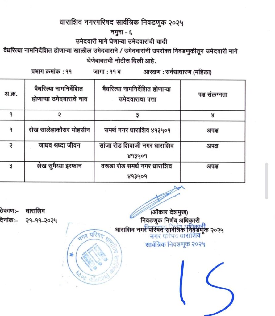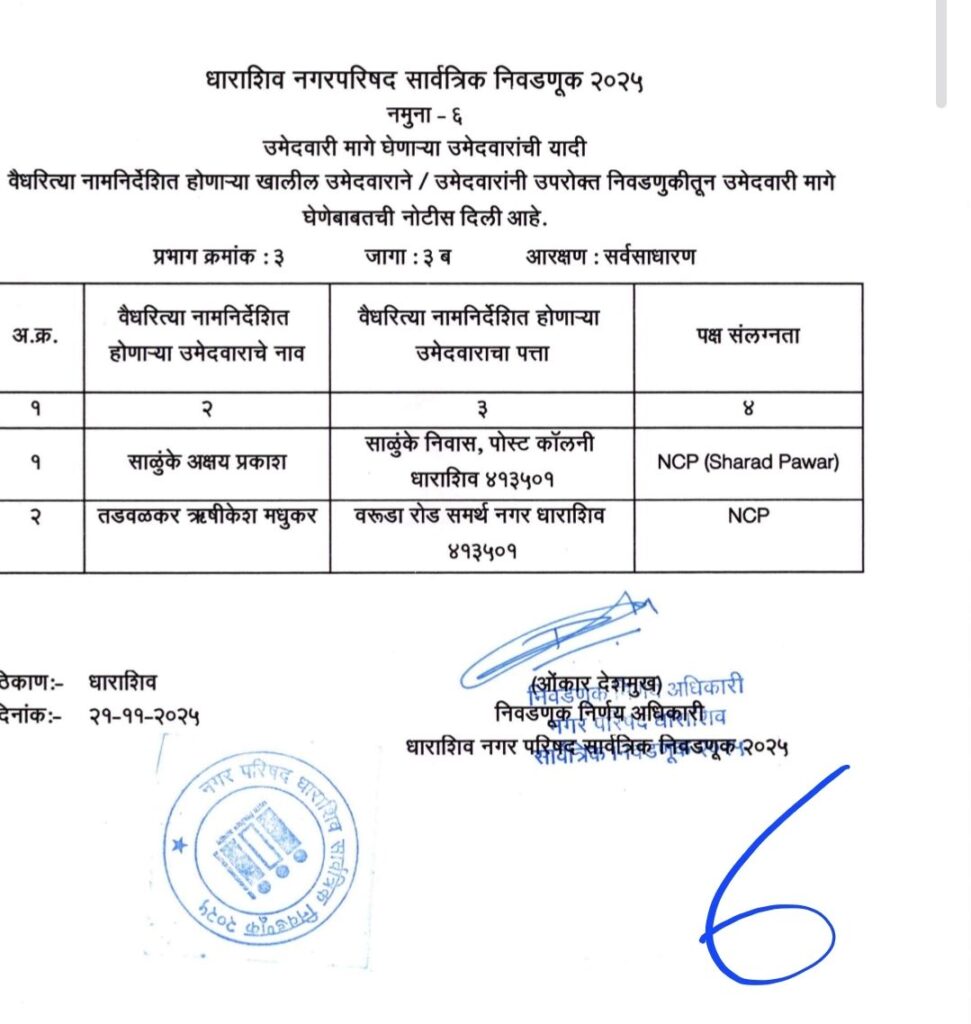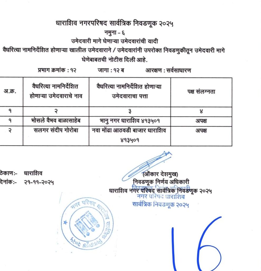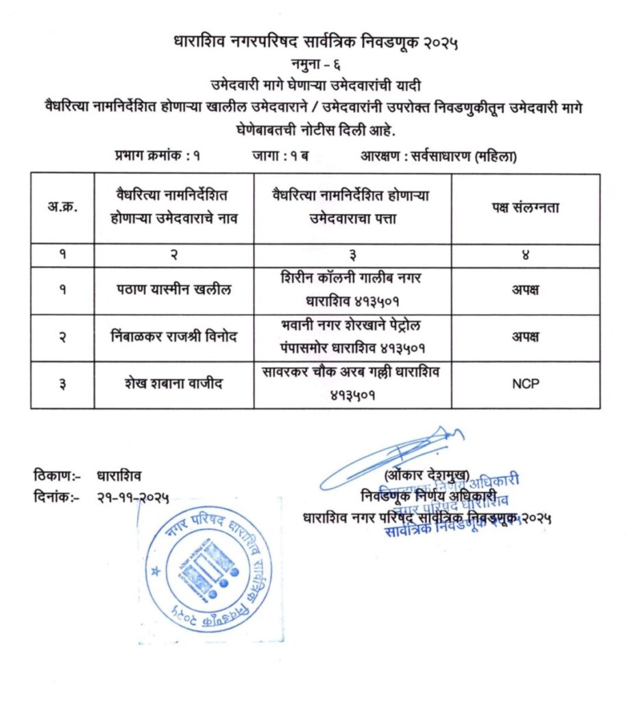 • शिवसेना उद्धव बाळासाहेब ठाकरे आणि काँग्रेस पक्षाचे धाराशिवनगर परिषदेचे अधिकृत उमेदवारी जाहीर हे आहेत नगराध्यक्ष आणि नगरसेवक उमेदवार