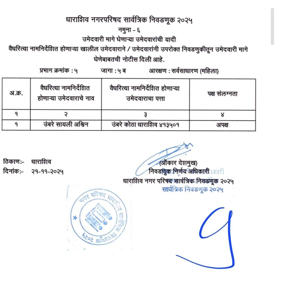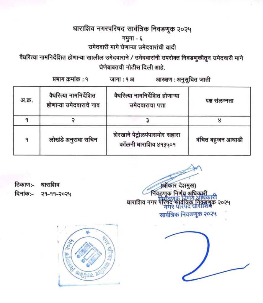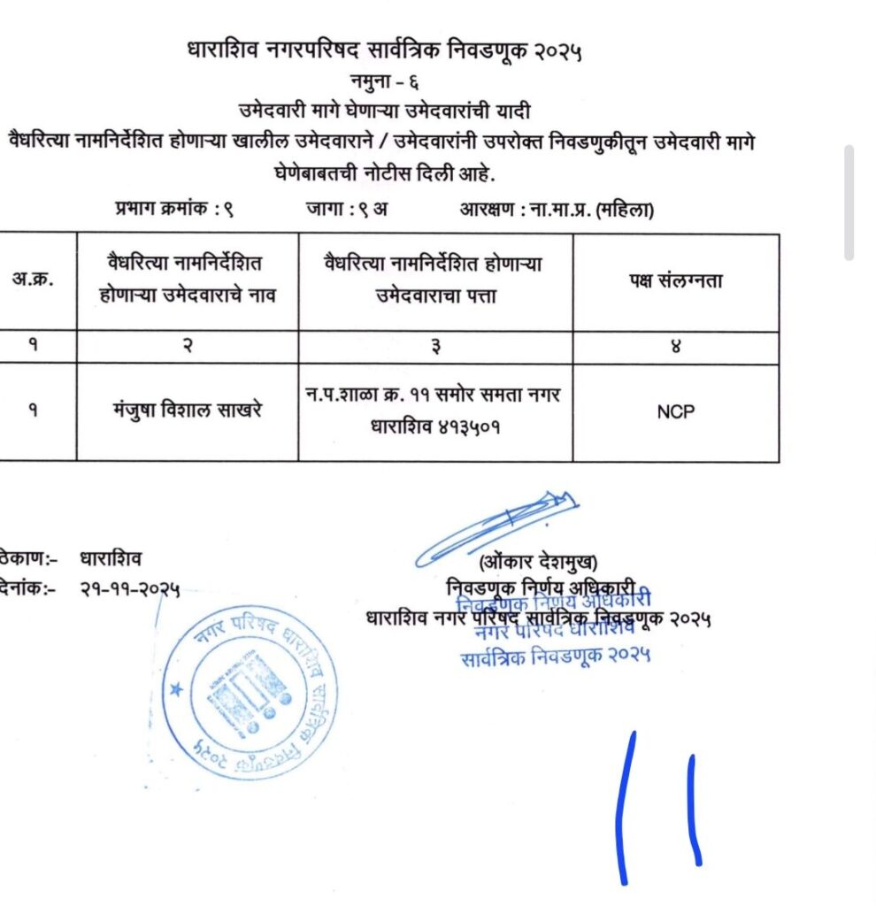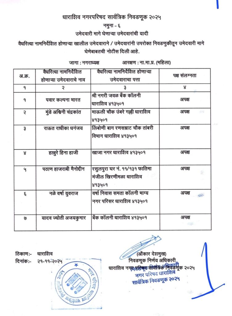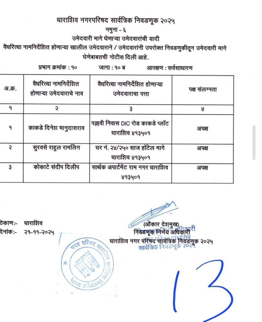 • शिवसेना उद्धव बाळासाहेब ठाकरे आणि काँग्रेस पक्षाचे धाराशिवनगर परिषदेचे अधिकृत उमेदवारी जाहीर हे आहेत नगराध्यक्ष आणि नगरसेवक उमेदवार