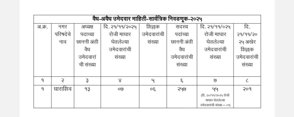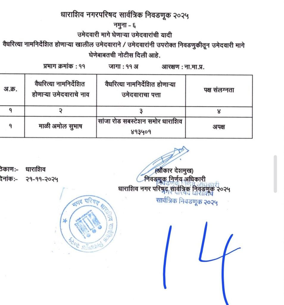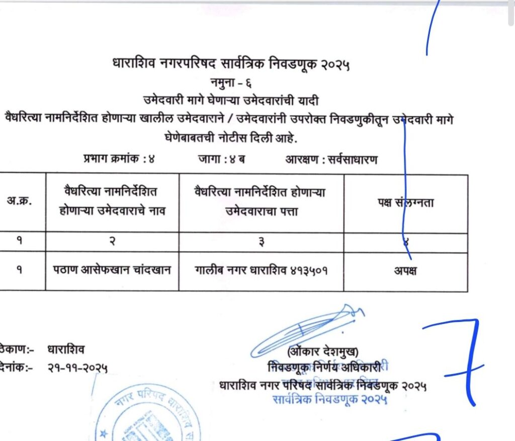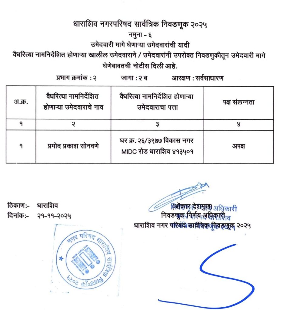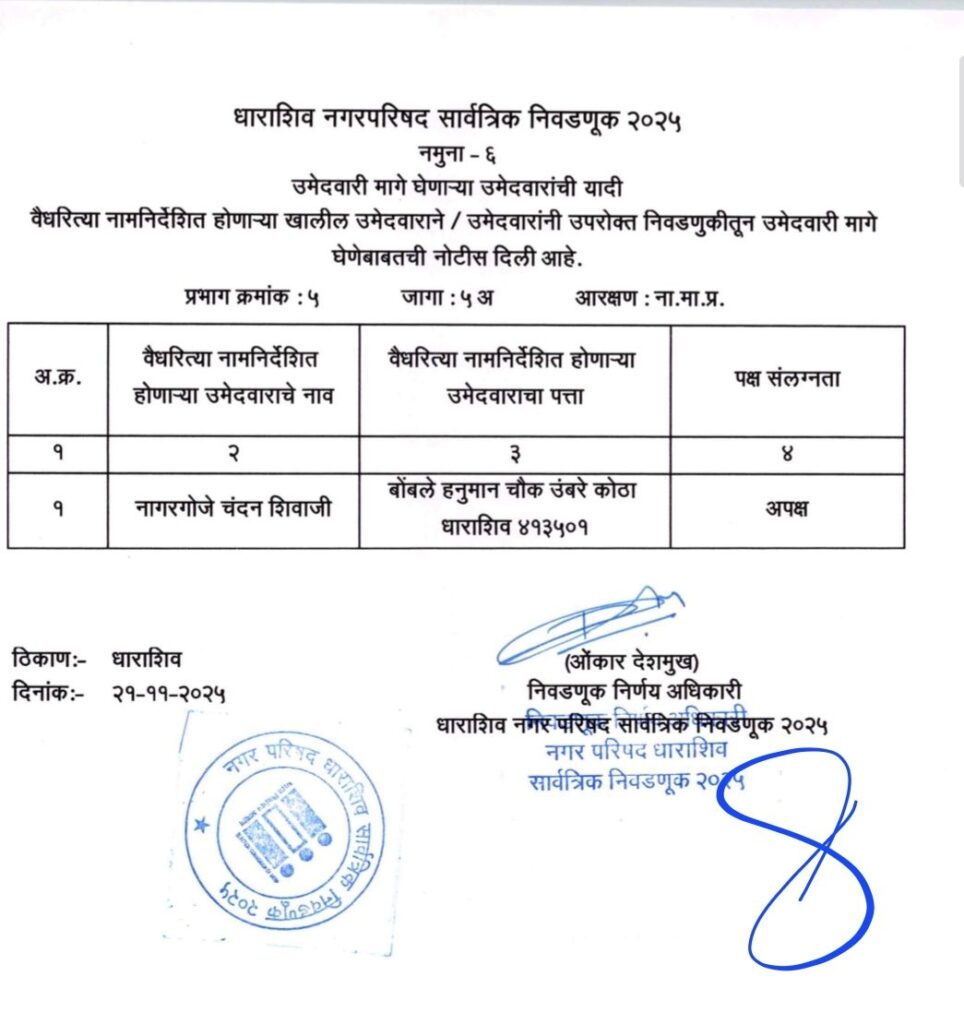 • शिवसेना उद्धव बाळासाहेब ठाकरे आणि काँग्रेस पक्षाचे धाराशिवनगर परिषदेचे अधिकृत उमेदवारी जाहीर हे आहेत नगराध्यक्ष आणि नगरसेवक उमेदवार