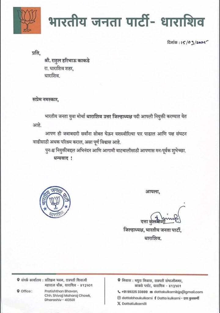 धाराशिव दि. 15 :भारतीय जनता पक्षाचे जिल्हाध्यक्ष दत्ताभाऊ कुलकर्णी यांनी राहुल हरिभाऊ काकडे यांची भारतीय जनता युवा मोर्चा धाराशिव उत्तर जिल्हाध्यक्षपदी नियुक्ती केली आहे.