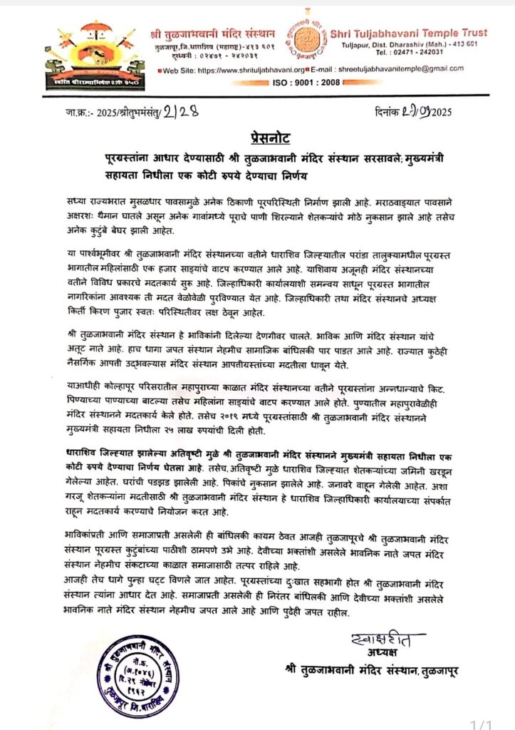 धाराशिव दि.२७ (अमजद सय्यद):राज्यातील मुसळधार पावसामुळे निर्माण झालेल्या पूरस्थितीत मराठवाड्यातील अनेक गावांमध्ये शेतकऱ्यांचे मोठे नुकसान झाले असून शेकडो कुटुंबे बेघर झाली आहेत. या कठीण काळात श्री तुळजाभवानी मंदिर संस्थान तातडीने मदतीला धावून आले आहे. पूरग्रस्तांना आधार देण्यासाठी संस्थानने मुख्यमंत्री सहायता निधीला तब्बल एक कोटी रुपये देण्याचा निर्णय घेतला आहे.