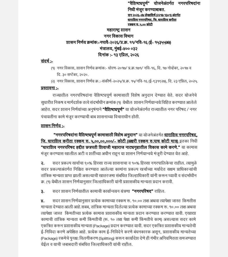 या निधीमुळे नाट्यगृह आधुनिक सुविधांनी सुसज्ज होणार असून धाराशिवच्या सांस्कृतिक क्षेत्राला मोठी चालना मिळणार आहे. नगराध्यक्ष नेहा काकडे यांच्या पुढाकारामुळे शहराच्या विकासाला गती मिळत असल्याची भावना नागरिकांमधून व्यक्त होत आहे.