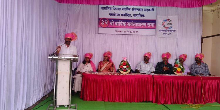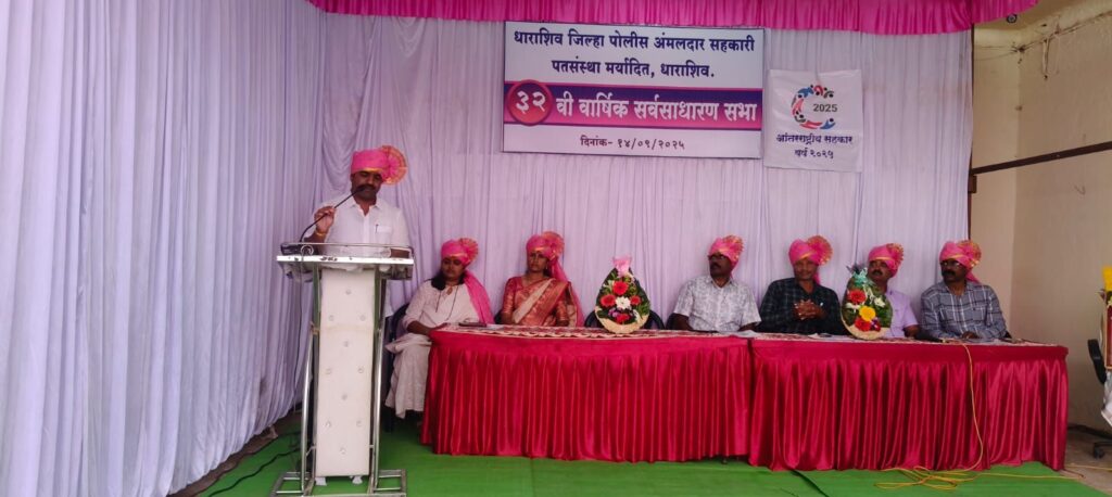 धाराशिव (प्रतिनिधी) : धाराशिव जिल्हा पोलीस अंमलदार सहकारी पतसंस्था मर्यादित धाराशिवची 32 वी वार्षिक सर्वसाधारण सभा रविवार दिनांक 14 सप्टेंबर 2025 रोजी दुपारी 12.30 ते 2.00 या वेळेत संस्थेच्या कार्यालयासमोर, पोलीस लाईन धाराशिव येथे उत्साहात पार पडली. या सभेच्या अध्यक्षस्थानी संस्थेचे अध्यक्ष गोविंद पवार होते. यावेळी प्रमुख पाहुणे फुलचंद जगदाळे, संस्थेचे मार्गदर्शक विशाल राजेश्वरकर व व्हाइस चेअरमन श्रीमती गितांजली फुलसुंदर (राऊत) उपस्थित होते.